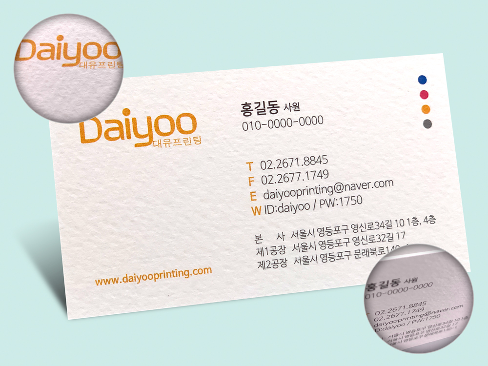 우둘투둘하고 존재감 있는 질감이 특징인 고급 친환경 명함 재질입니다. FSC 인증 친환경 용지로 보존성이 뛰어나며, 색이 연하게 표현되므로 밝은 색상의 디자인을 추천드립니다.